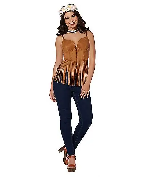 Rock a throwback look with this brown suede top! Featuring fringe along the bottom, this top is perfect for any vintage, western, or hippie costume!