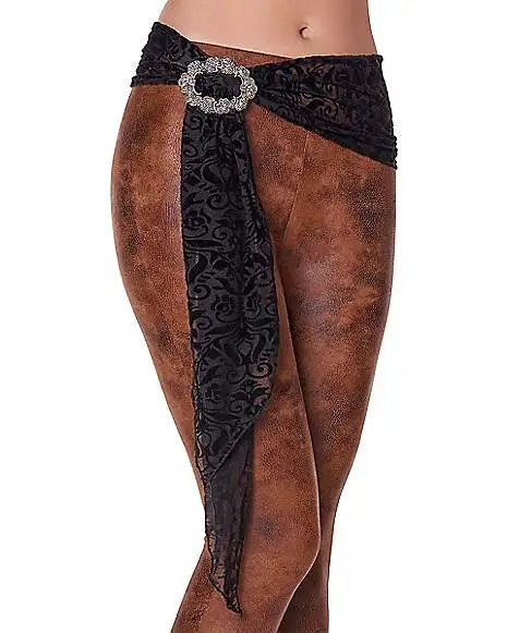 Perfect your pirate costume with these regal rebels pirate leggings! These faux leather leggings include a decorative sash that drapes around the hips. An ornate buckle adorns the sash, preparing you to sail the seas in style.