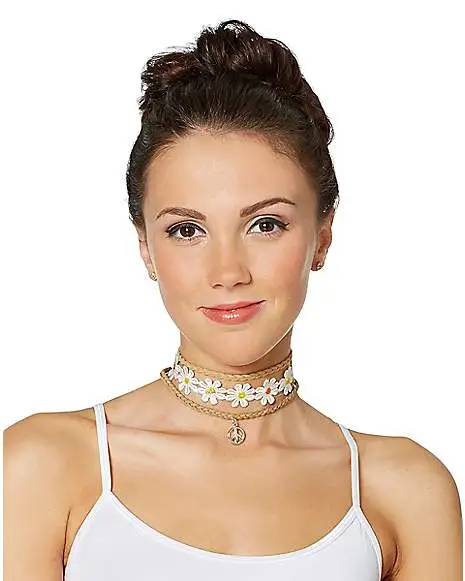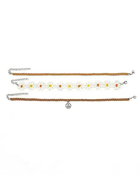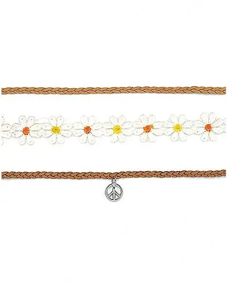 Get ready to embrace a hippie style with this Daisy Fabric Choker Set! The set includes three chokers: a navy braided one, a thing tan braided one, and one make up of white daises with a silver peace sign hanging off it! Go back to the 70’s and let everyone know that you love nature and peace with these necklaces!