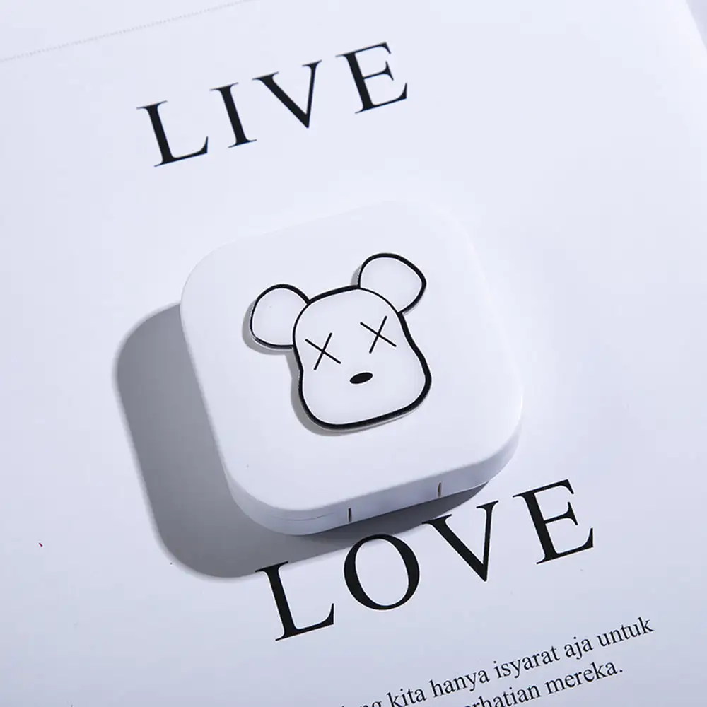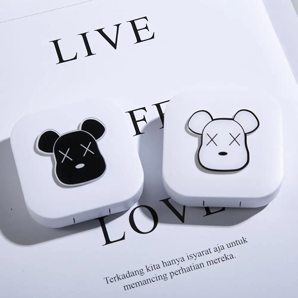 Step up your contact lens game with our stylish bear-shaped contact lens case, featuring trendy X eyes design. Available in chic black and white, this must-have set includes a mirror, tweezer, and holder for wearing contact lenses, as well as a solution bottle. Compact and travel-friendly, this case is the perfect accessory for any fashion-forward contact lens wearer.